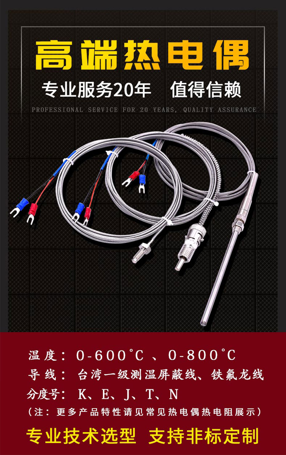 特殊规格可定制分度号: 热电偶:K、E、J、T、N 热电阻:Pt100、Pt1000、Cu50等温度规模:0-200℃、0-400℃、0-600℃、0-800℃、-50-200℃、-50-450℃螺纹规格:M6、1/4"、M8、M12等......引线规格:P=高温屏障玻璃硅胶线、B=高温玻璃纤维线、F=四氟线
